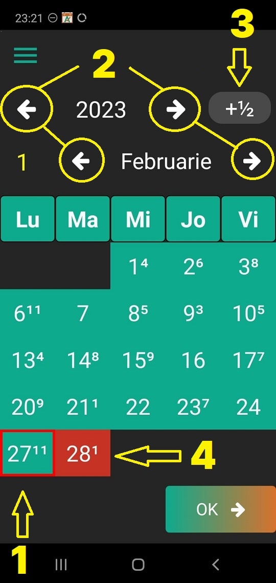 De asemenea, aveți un buton cu opțiunea +½ pentru a înainta în calendar cu 6 luni dintr-o singură apăsare. (3)