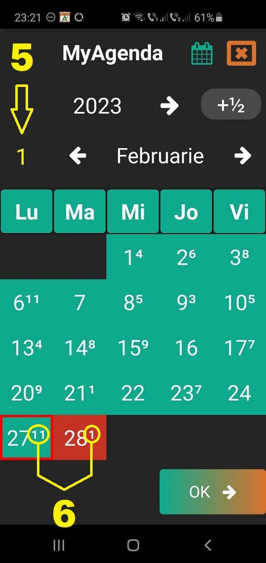 Veți observa imediat după apăsare, în galben, numărul de programări pe acea zi. (5)