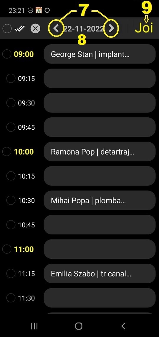 În secțiunea cu programările pe oricare zi puteți naviga cu o zi în plus sau în minus apăsând pe săgețile dreapta sau stânga, în partea de sus mijloc lângă dată. (7)