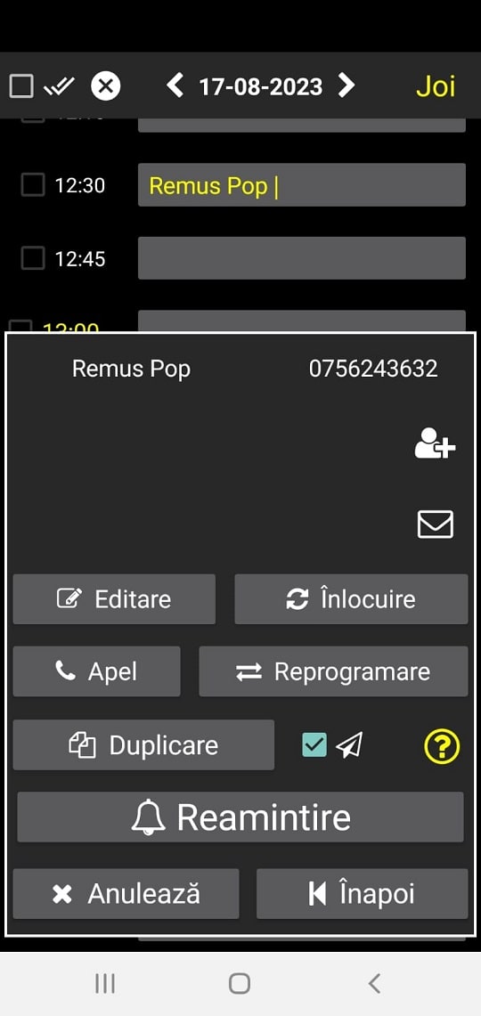 Dacă apăsați pe o programare care există deja în agendă puteți alege una din următoarele 11 acțiuni: