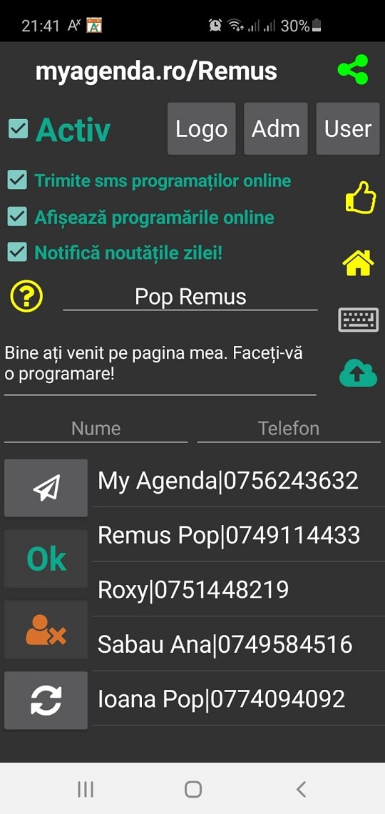 6. Pentru a adăuga clienții online trebuie să le transmiteți link-ul aflat sus de tot. Ex: myagenda.ro/Remus