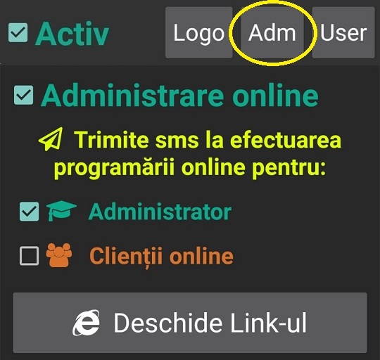 Daca este bifata optiunea 'Administrator', aplicatia va trimite catre clienti mesajele de programare efectuate de catre acesta, intr-un interval de 15 minute de la efectuarea acestei programari.