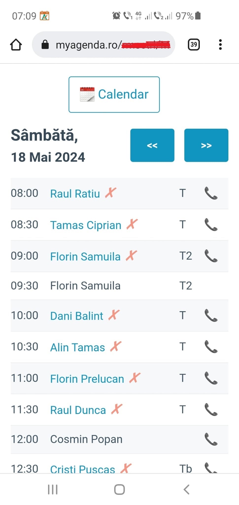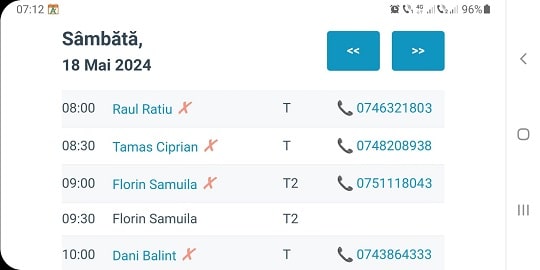 Contactul 'Florin Samuila' este tot în negru dar este o programare online pe două poziții, la care se repetă numele de deasupra. Apăsarea pe X va șterge ambele poziții.