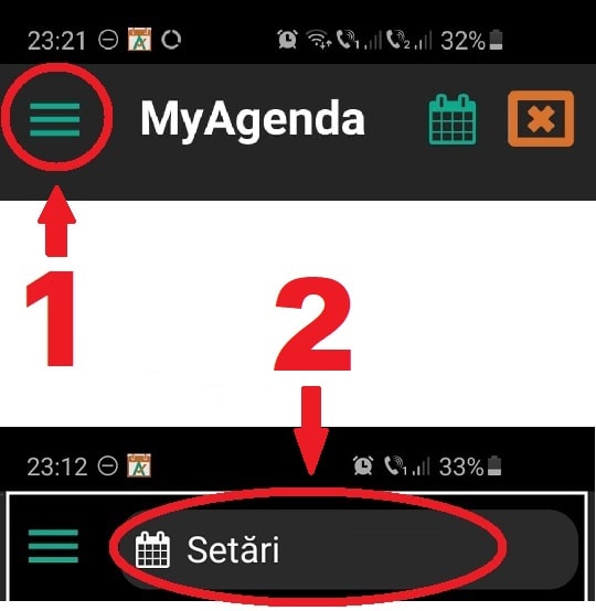 Setările calendarului pot fi accesate din Meniu(≡) - Setări Calendar sau direct de pe iconița în dreapta siglei MyAgenda de sus