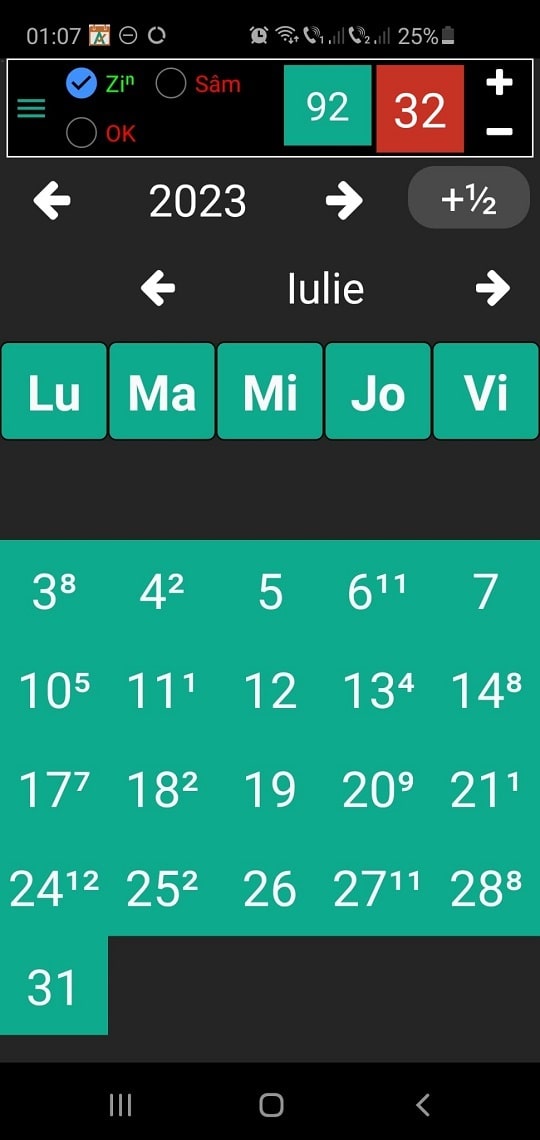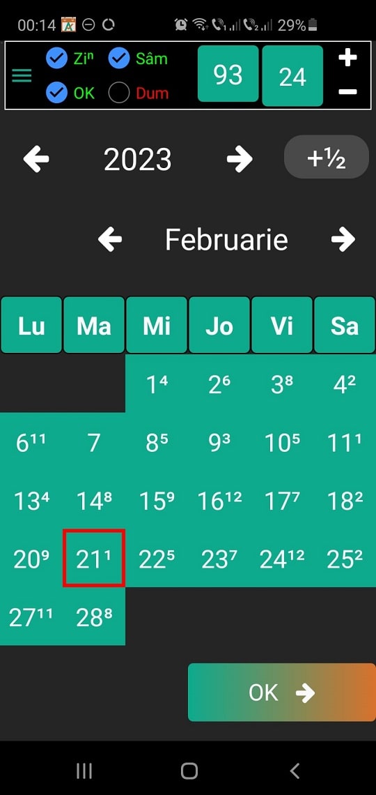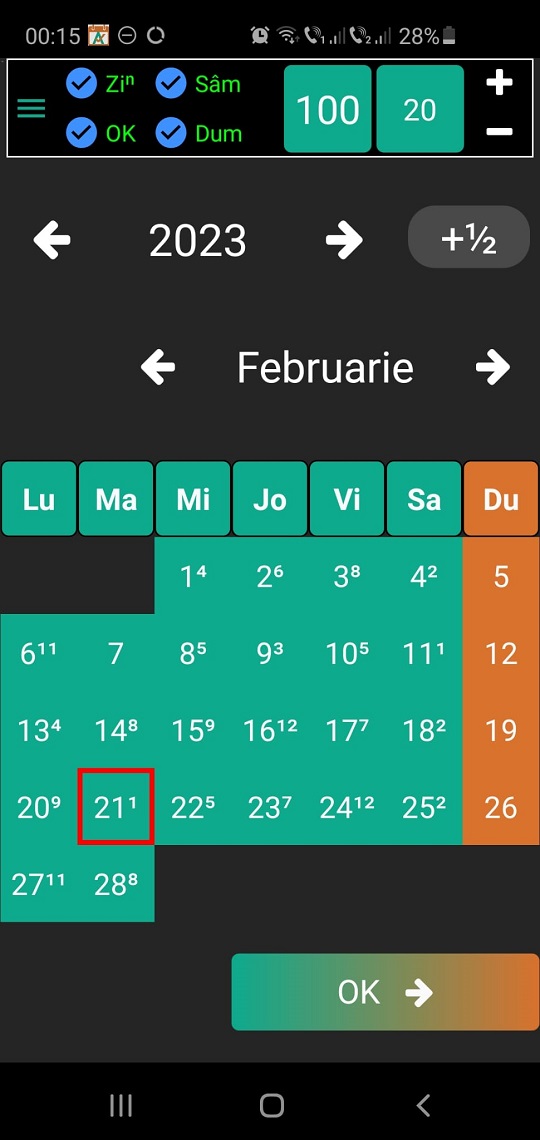 Puteți alege să nu afișați ziua de Duminică, pentru a avea mai mult spațiu în calendar alocat unor butoane mai mari de Luni până Sâmbătă.
