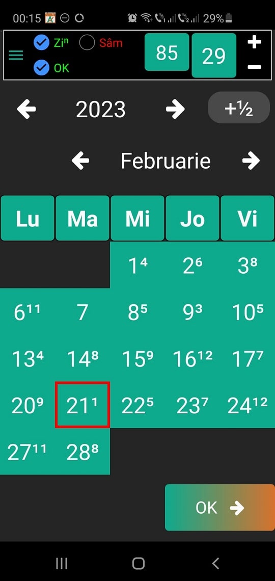(4) Imediat sub, opțiunea OK, care afișează butonul OK în partea de jos, dacă este bifat! Dacă îl debifați, nu veți mai avea de apăsat pe OK, și veți fi imediat direcționat spre ziua corespunzătoare în agendă la apăsarea pe ziua dorită.